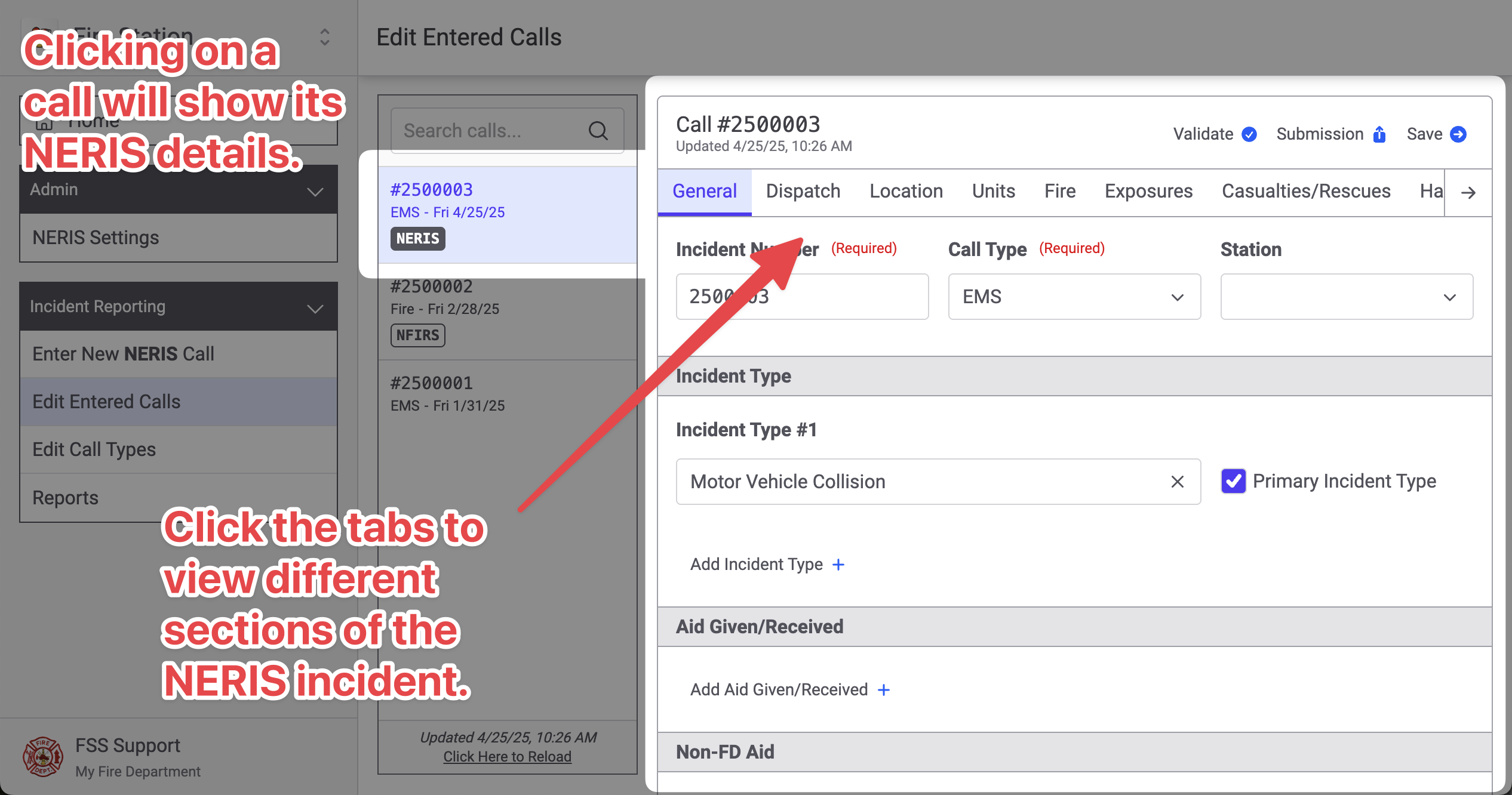 Follow these instructions to learn how to enter NERIS incidents from Fire Station's online platform. NERIS incidents are entered into Fire Station as call records. Then the NERIS call record is validated with NERIS and submitted to create the incident in NERIS. Calls that have been submitted to NERIS then updated in Fire Station may be re-submitted to NERIS.