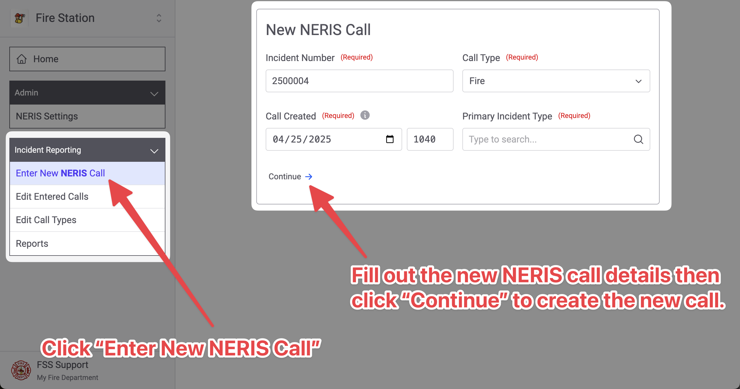 To create a new NERIS call, click the "Enter New NERIS Call" from the "Incident Reporting" section of the menu.