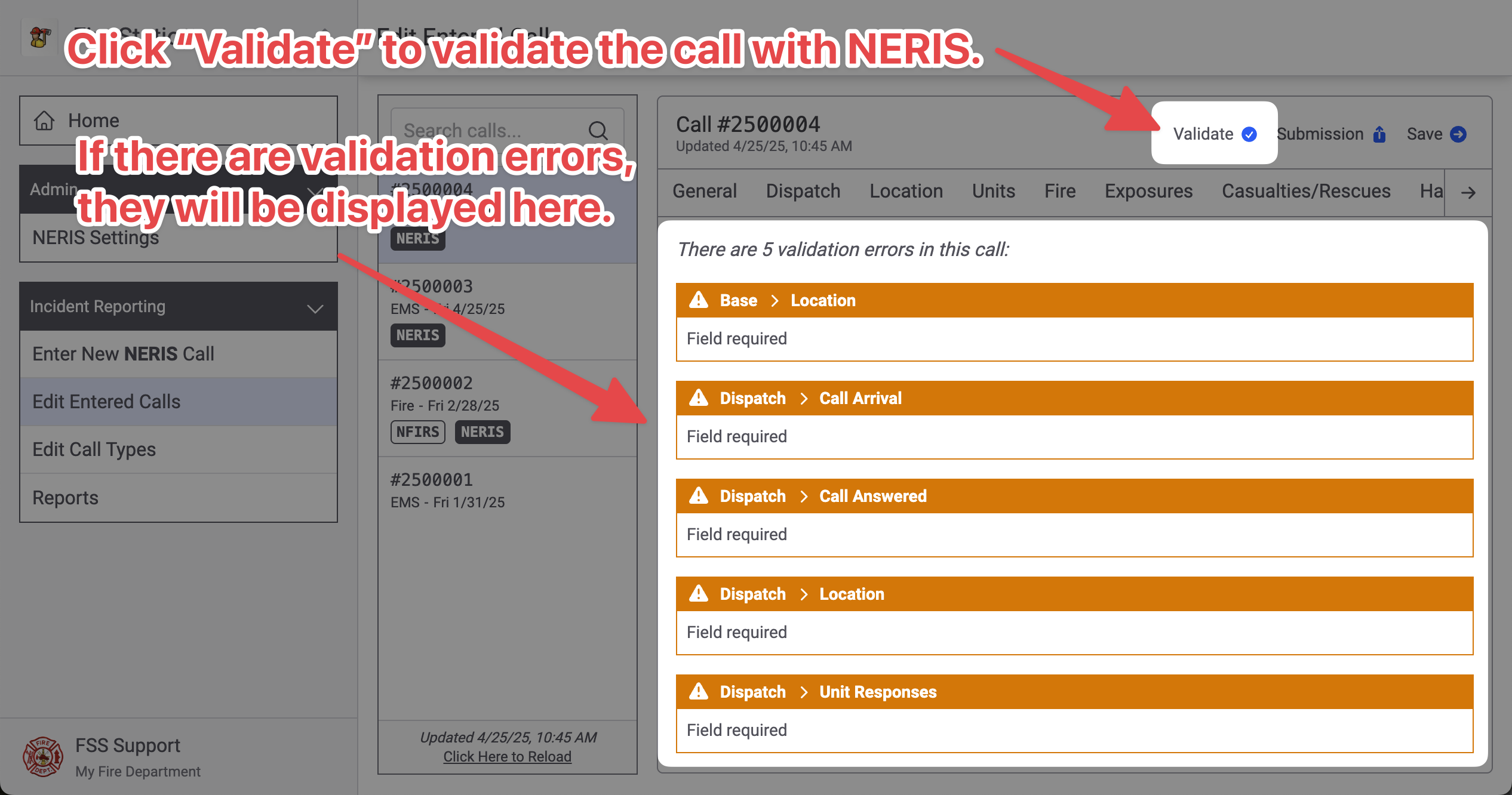 Validation issues are returned directly from NERIS as soon as you click the "Validate" button