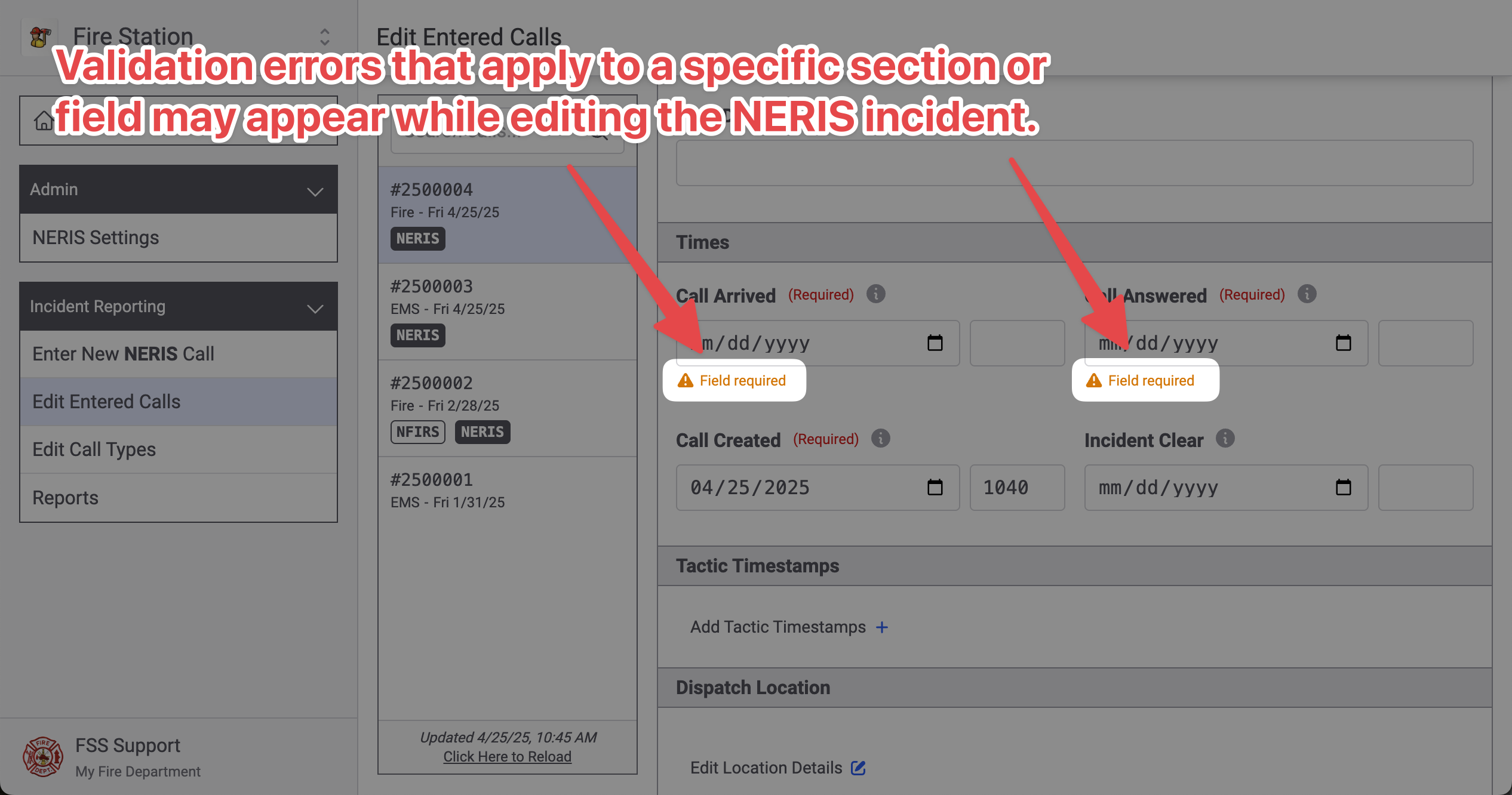 Note that validation errors do not disappear until the error has been corrected and the validate button has been clicked again, re-validating the call with NERIS.