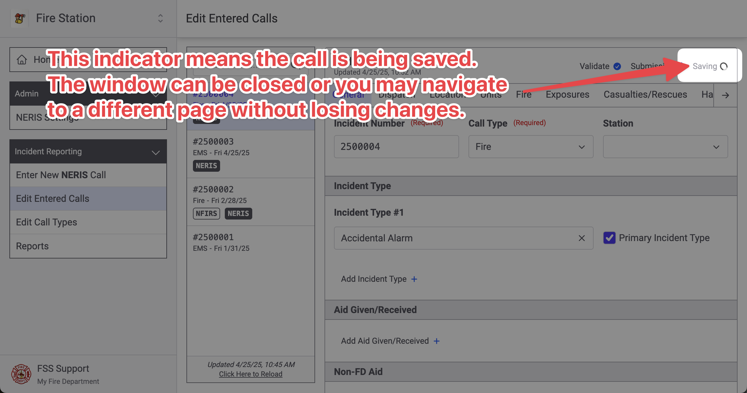 The NERIS incident is automatically saved as you enter data. There is no need to click the save button. You will see this saving indicator in the top right while the call is being saved. It is ok to close the window or reload the page while the call is being saved, the changes will not be lost.