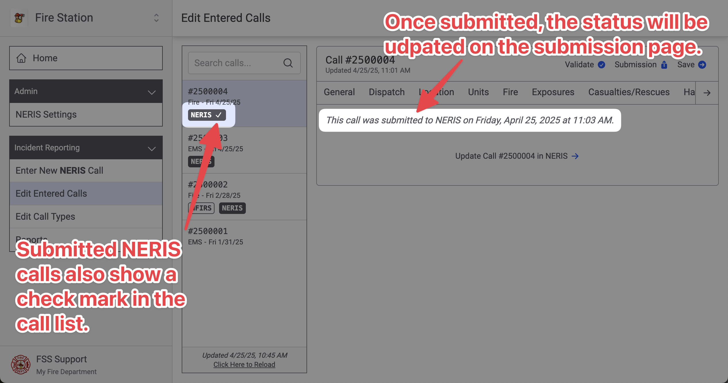 The call will be submitted and the status will be updated. Calls that have been submitted to NERIS show a checkmark in the call list.