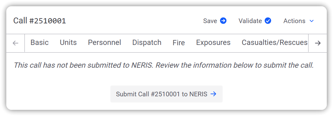Once a NERIS call has been validated, the call can be submitted to NERIS. This will create the NERIS incident in NERIS.