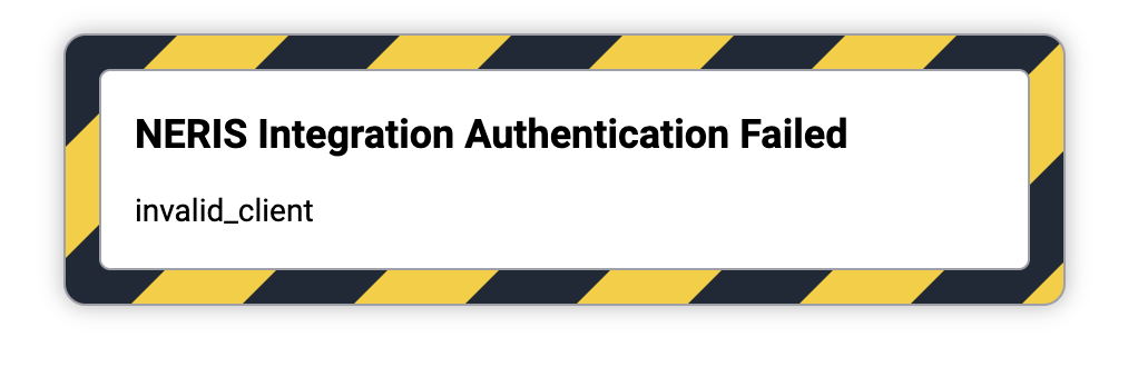 If you see the error message "invalid_client" ensure that you have granted access to the Fire Station NERIS Integration's Client ID in your NERIS Department. If you need the Client ID value it can be accessed by clicking the "NERIS Settings" in the "Admin" menu section.