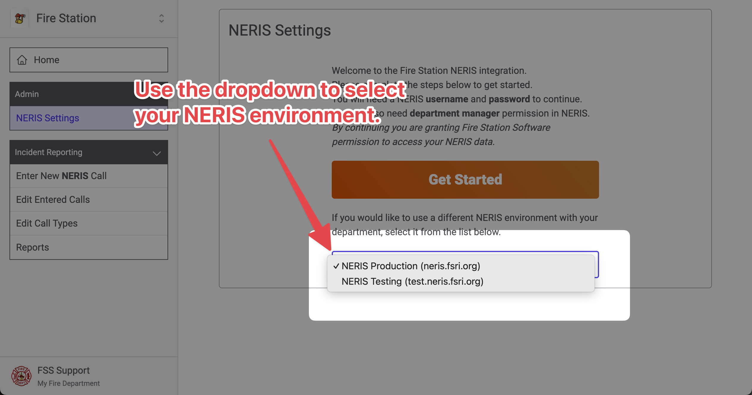 Once your NERIS environment has been selected, click the "Get Started" button and enter your NERIS username & password when prompted.