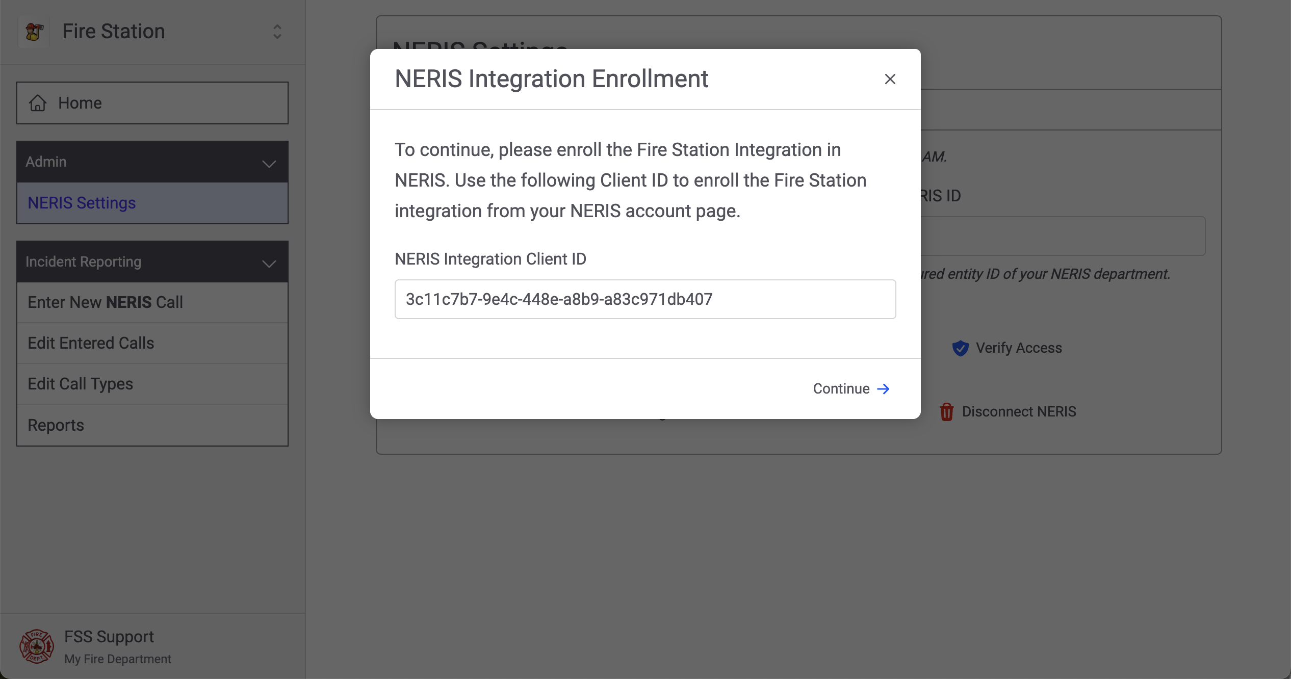 If you are not a department administrator in NERIS you will see the following message and you must sign into NERIS and grant access to Fire Station using the integration Client ID shown. Once this is complete click the "Continue" button to close the modal.