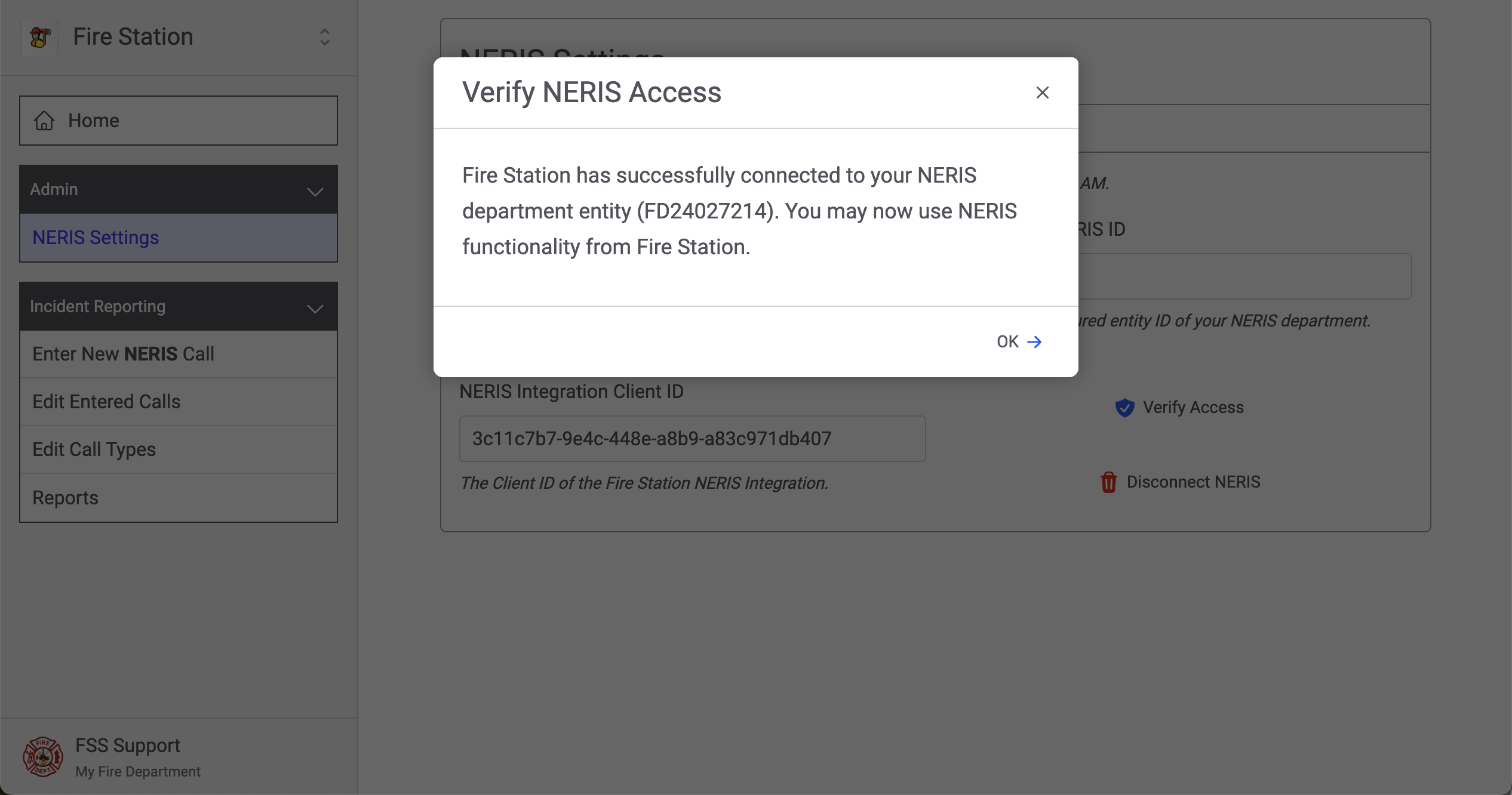 Once you have selected your department (and added the integration Client ID to your department in NERIS, if needed) you will see the NERIS Settings page. Click the "Verify Access" button to ensure that Fire Station can connect to your NERIS department.
