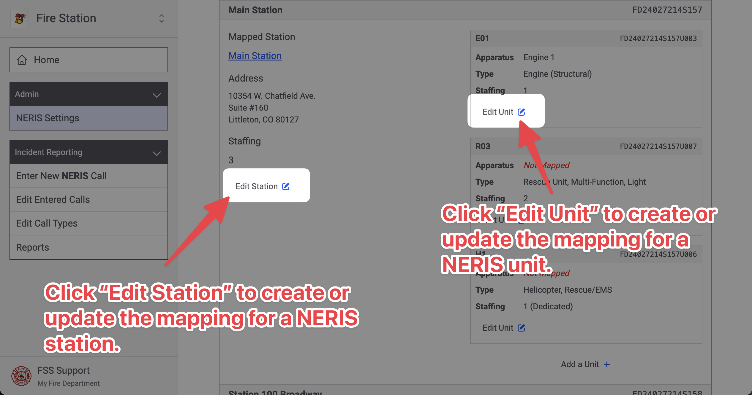 You can edit a NERIS station's mapping by clicking the "Edit Station" button in the station's section. You can also edit a NERIS unit's mapping by clicking the "Edit Unit" button in the unit's section.