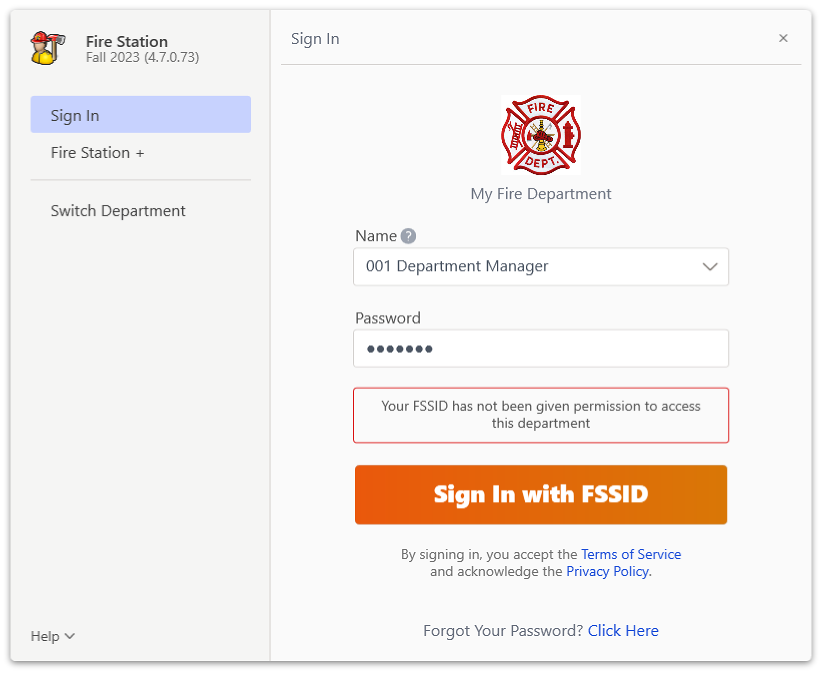 For security purposes, Sign In with FSSID is required for departments using Cloud Data Hosting. After upgrading to the Fall 2023 release, departments using Cloud Data Hosting can still sign in using a Fire Station Desktop User for 30 days.