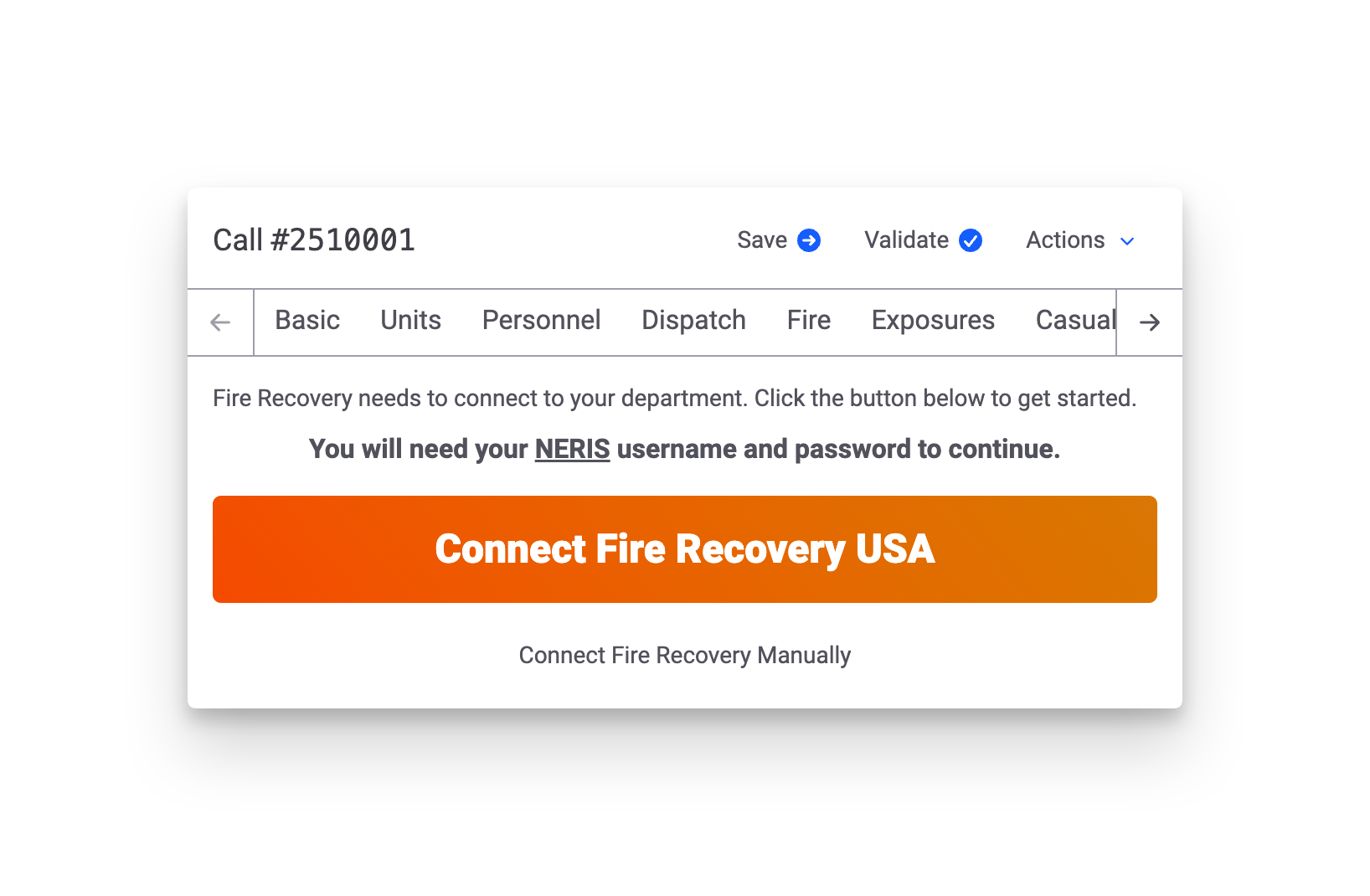 The first time you submit a NERIS call to Fire Recovery USA you will be guided through the necessary setup process.