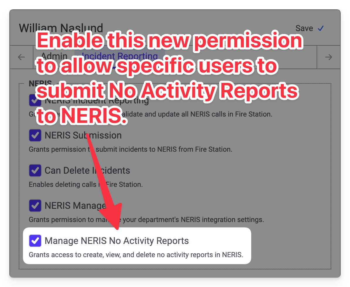 Turning this permission on allows you to access the new NERIS No Activity Reports page in the Incident Reporting menu.