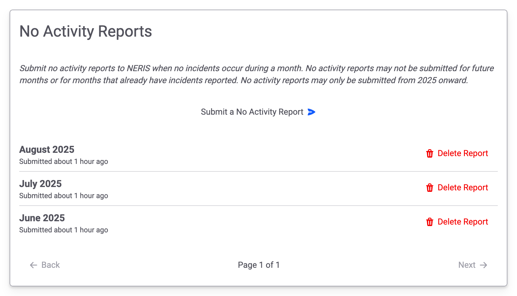 Accessing this link will take you to the new No Activity Reports page. You will see a list of No Activity Reports that have been previously submitted. Clicking the Submit a No Activity Report button allows you to send new reports to NERIS. Clicking the Delete Report button allows you to delete the No Activity Report in both NERIS and Fire Station.