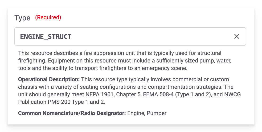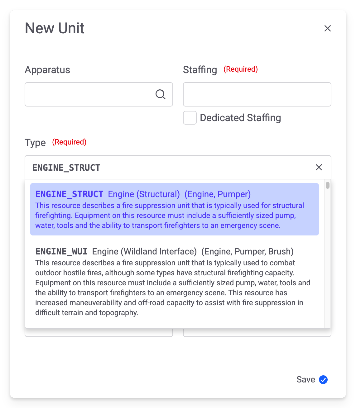 The Type dropdown used to create/update NERIS units from Fire Station has been updated to include more details to help you select the correct option: