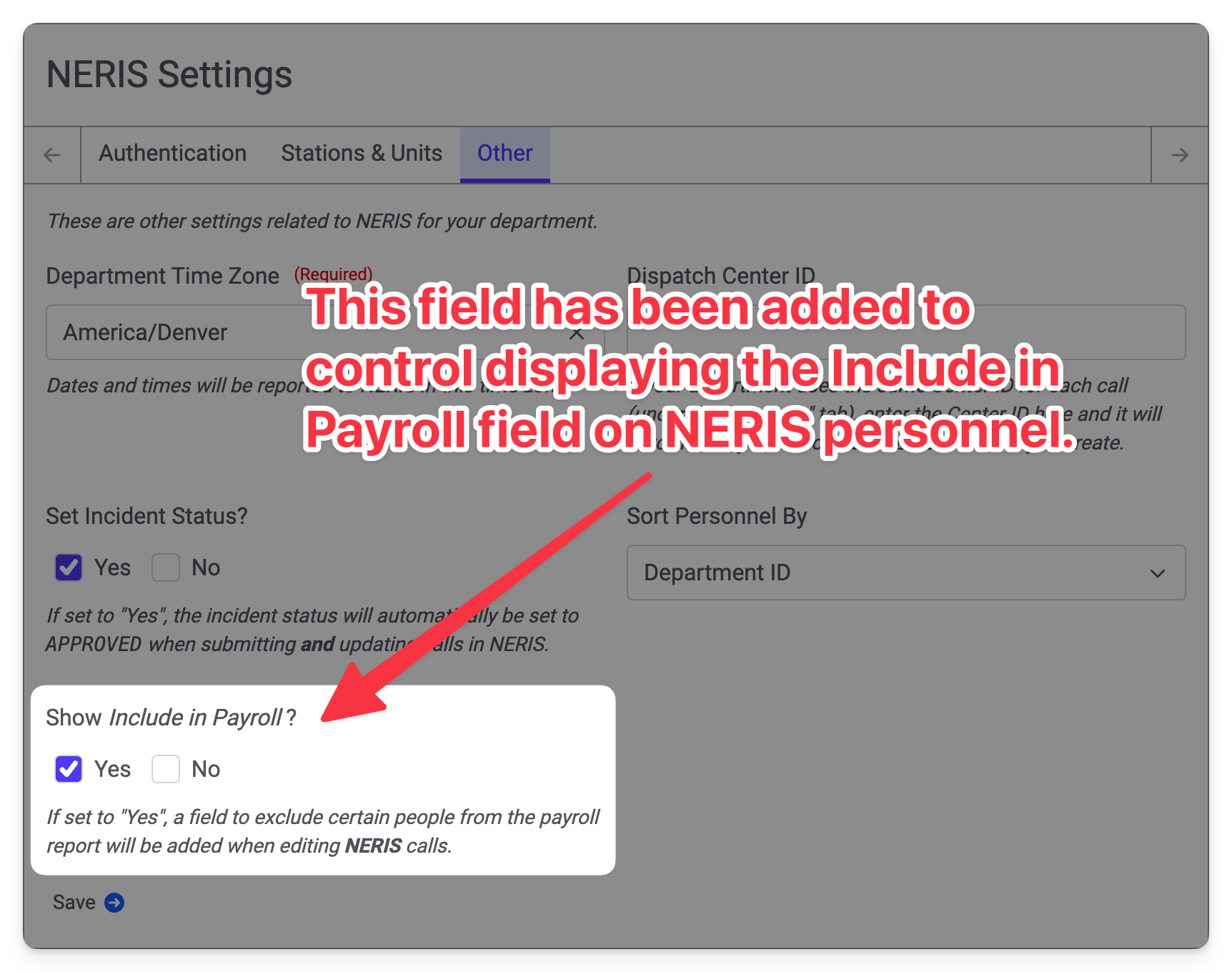 It is now possible to disable the Include in Payroll field when adding personnel to a NERIS call. Previously this was enabled for all departments. A new option on the Other tab of the NERIS Settings page has been added to control this field: