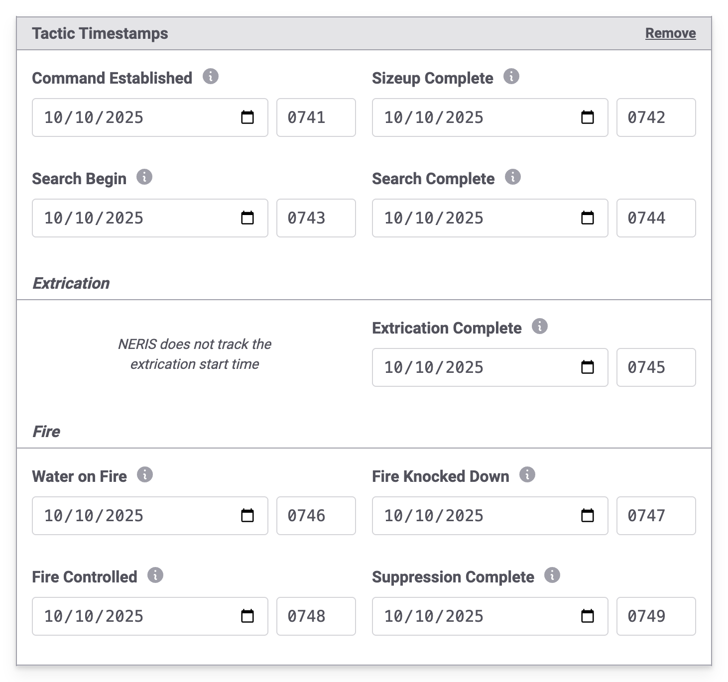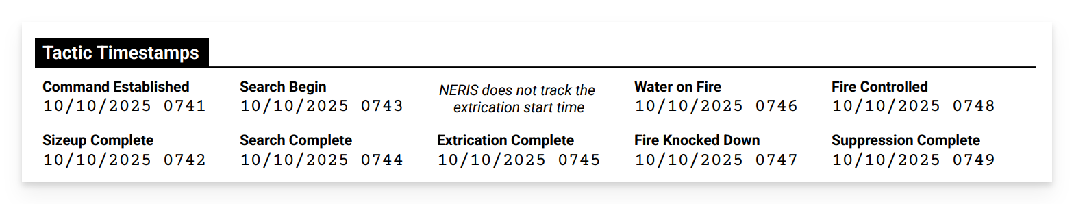 The layout of the Tactic Timestamps section of NERIS calls has been updated to look like this: