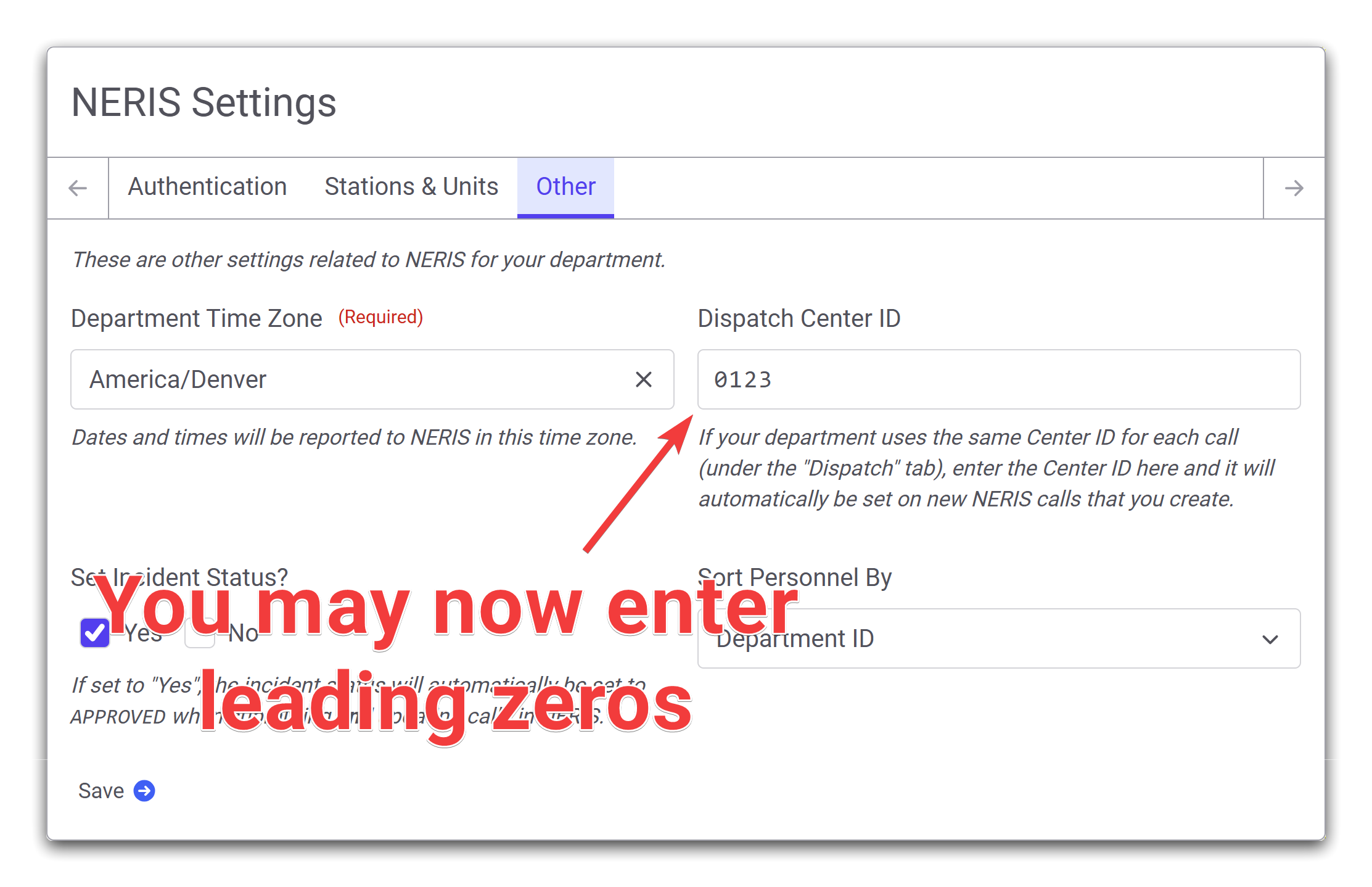 A bug has been corrected that prevented entering leading zeroes in the default Dispatch Center ID that is configured under the Other tab on the NERIS Settings page.