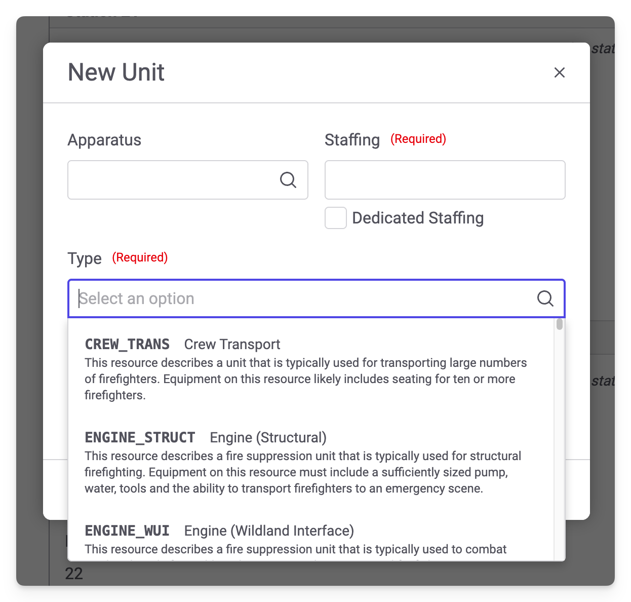 The NERIS unit editing modal used to create/update NERIS units from Fire Station has been updated to add additional details while selecting the unit type. Previously, the modal looked like this: